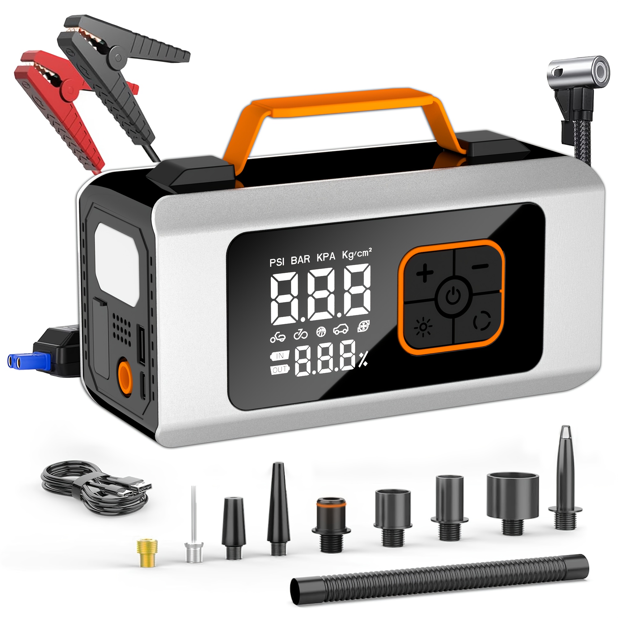 It combines jump starter, tire inflator, inflation/deflation pump, LED light and portable charger in one compact unit. This all-in-one solution is a convenient tool for roadside emergencies, camping trips or daily car maintenance.
