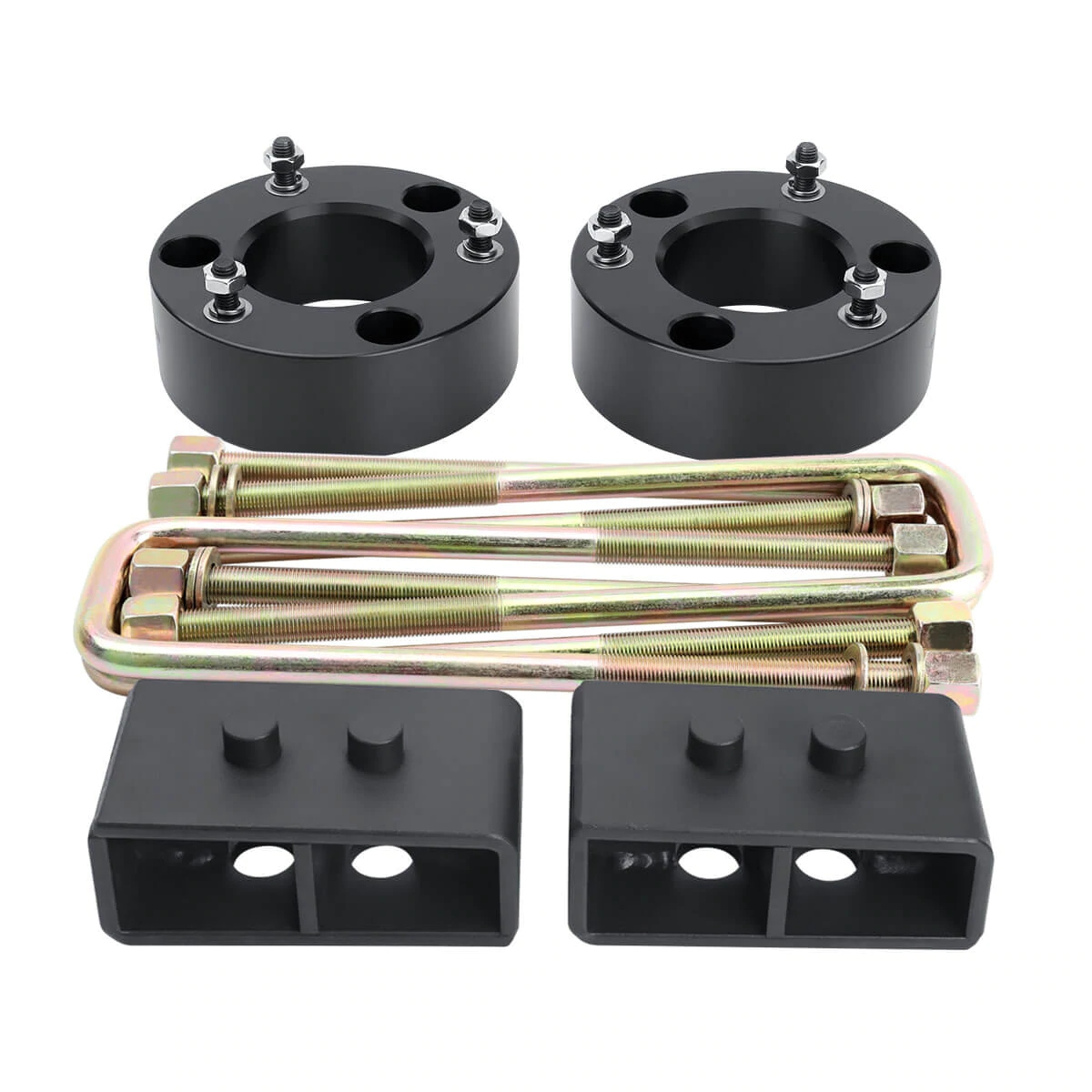 Leveling Lift kit comes with aircraft aluminum strut spacer ,new fabricated rear lift blocks and extended U bolts. And It will raise your Ford by a true 3" in the front and 2" in the rear. To correct the stance of your vehicle and provide additional lift to get more ground clearance or run up larger tires.Can be installed in about 2-3 hours and does not require strut/coil disassembly like other kits.